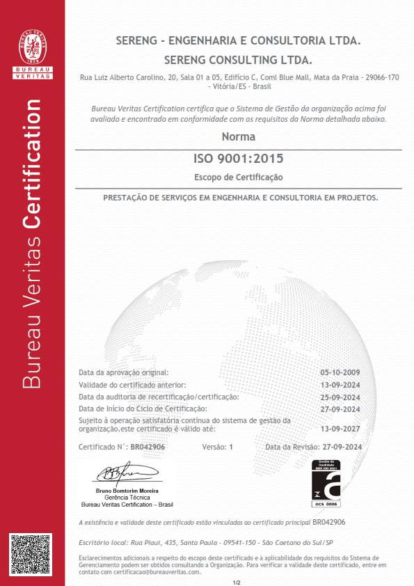 As empresas do Grupo Sereng são certificadas ISO 9001/2015 – Bureau Veritas (BVQI).